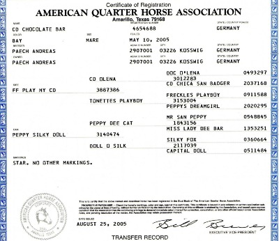 In ihr vereint sich väterlicherseits die bewährte Anpaarung Doc O´Lena x Peppy San Badger x Freckles Playboy.